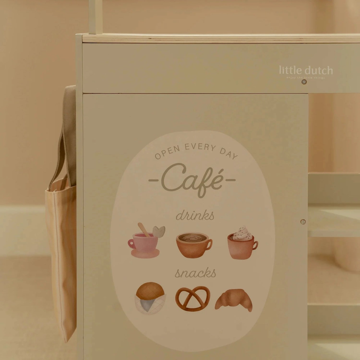 Com esta bonita tenda de madeira, as crianças podem brincar às lojas. A cobertura de tecido cria uma atmosfera autêntica de mercado e, com o quadro negro e os cartões ilustrados, podem expor os produtos de forma elegante. O conjunto inclui ainda um saco de compras e caixas para uma experiência de compras autêntica. Vire a tenda e esta transforma-se num café, completo com um menu e ilustrações alegres. Combine com a caixa registadora, a balança ou o stand de doces em camadas para ainda mais diversão. Qual é o menu de hoje?