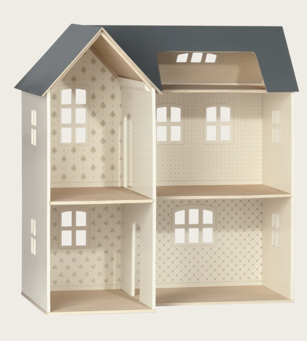 Casa de bonecas Maileg com paredes lindamente decoradas. Produtos que cabem na casa: Coelhinho/Coelho tamanho 1, 2, micro, meu, família Teddy e móveis e acessórios em miniatura.
