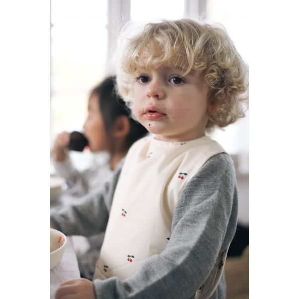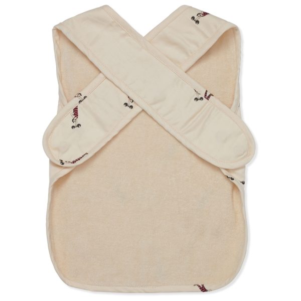 Os comedores animados ficarão cobertos durante as refeições com o babador longo orgânico com um bolso na frente. Fácil de abrir e fechar com alças e botões.
