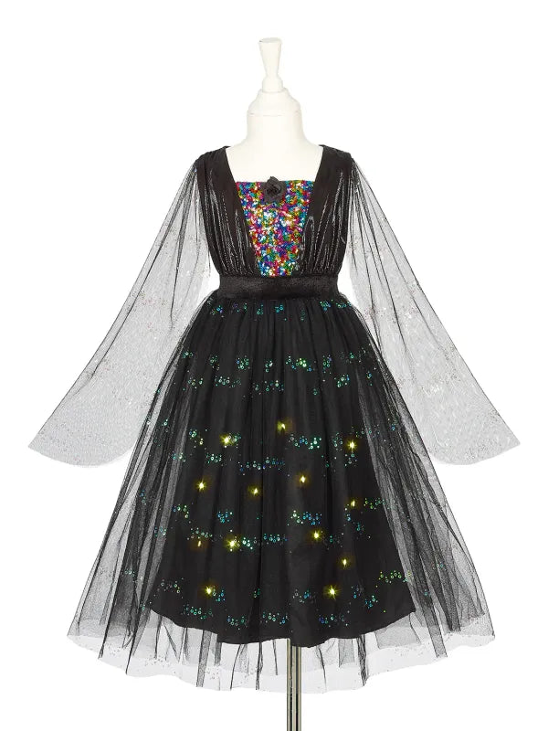 Estrelinha, brilha, brilha, vejo-te ao longe! Enquanto Agatha, a pequena bruxa, desliza pelo céu estrelado, o seu vestido brilha na noite. Este vestido é único porque é adornado com pequenas luzes brilhantes escondidas na saia! O vestido Agatha é 100% poliéster.