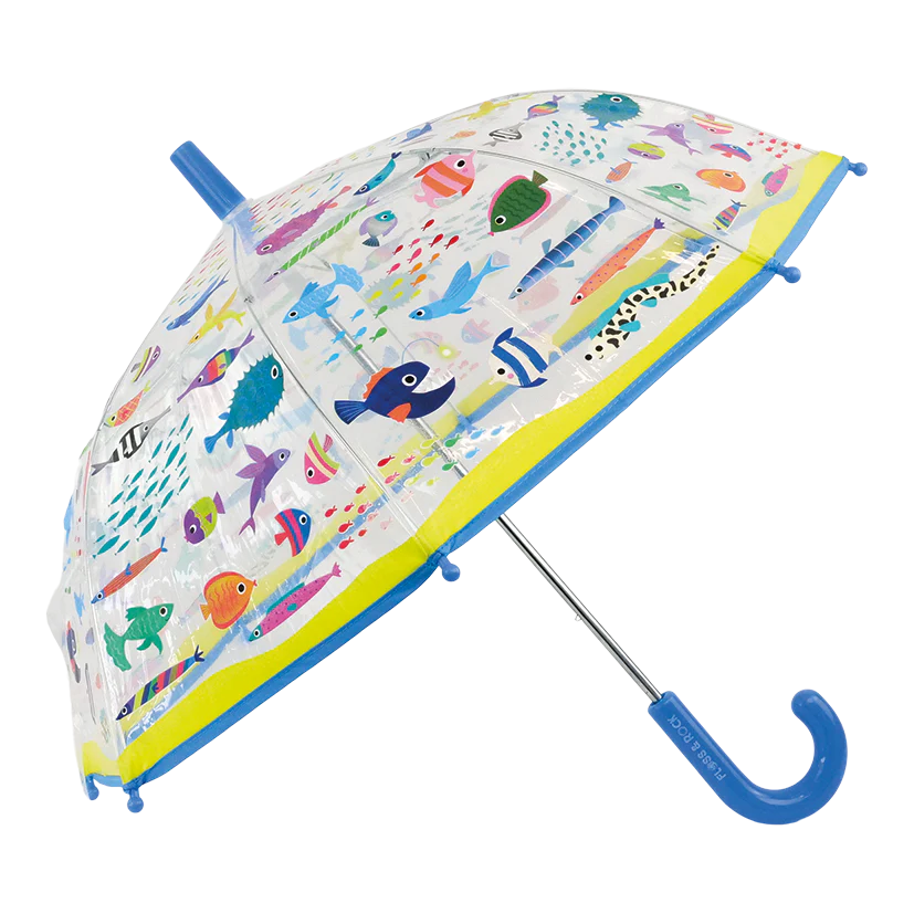 Veja como as áreas brancas mudam magicamente de cor na chuva e, quando secam, voltam a ser brancas. Tudo acontece de novo quando a chuva regressa. Este design transparente inspirado no oceano tem muitos peixes coloridos e interessantes que adoram nadar à chuva!