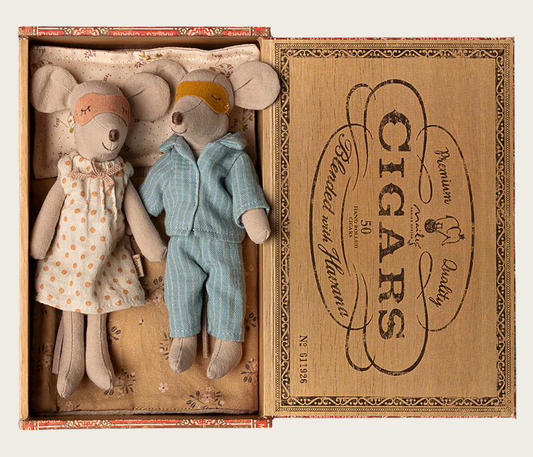 Um item clássico da Maileg. A mamã e o papá ratinhos estão a usar as suas lindas roupas de dormir e máscaras para os olhos. A caixa de charutos é a cama perfeita para uma boa noite de sono e bons sonhos.
