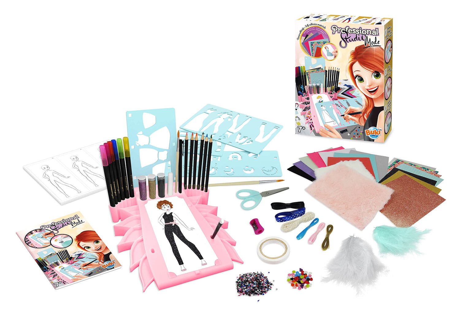 Coloca una figura, diseña prendas con las plantillas y luego rellénalas utilizando los distintos complementos incluidos: tela autoadhesiva, plumas, purpurina, fieltro, cintas, rotuladores, lápices acuarelables, tijeras, sacapuntas y mucho más.