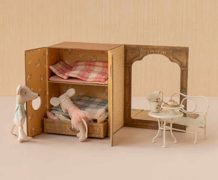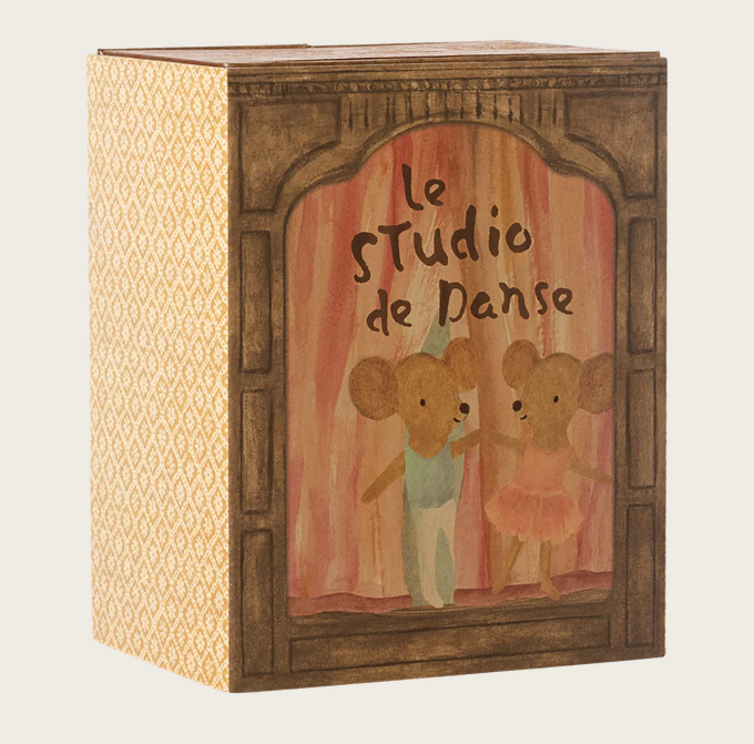 Abra as portas desta caixa mágica e explore um mundo de dança, poeira estelar e histórias. Este conjunto inclui uma caixa de papel, que funciona tanto como estúdio de dança como acolhedora para ratos, bem como dois ratos vestidos para horas de dança com as suas belas roupas.