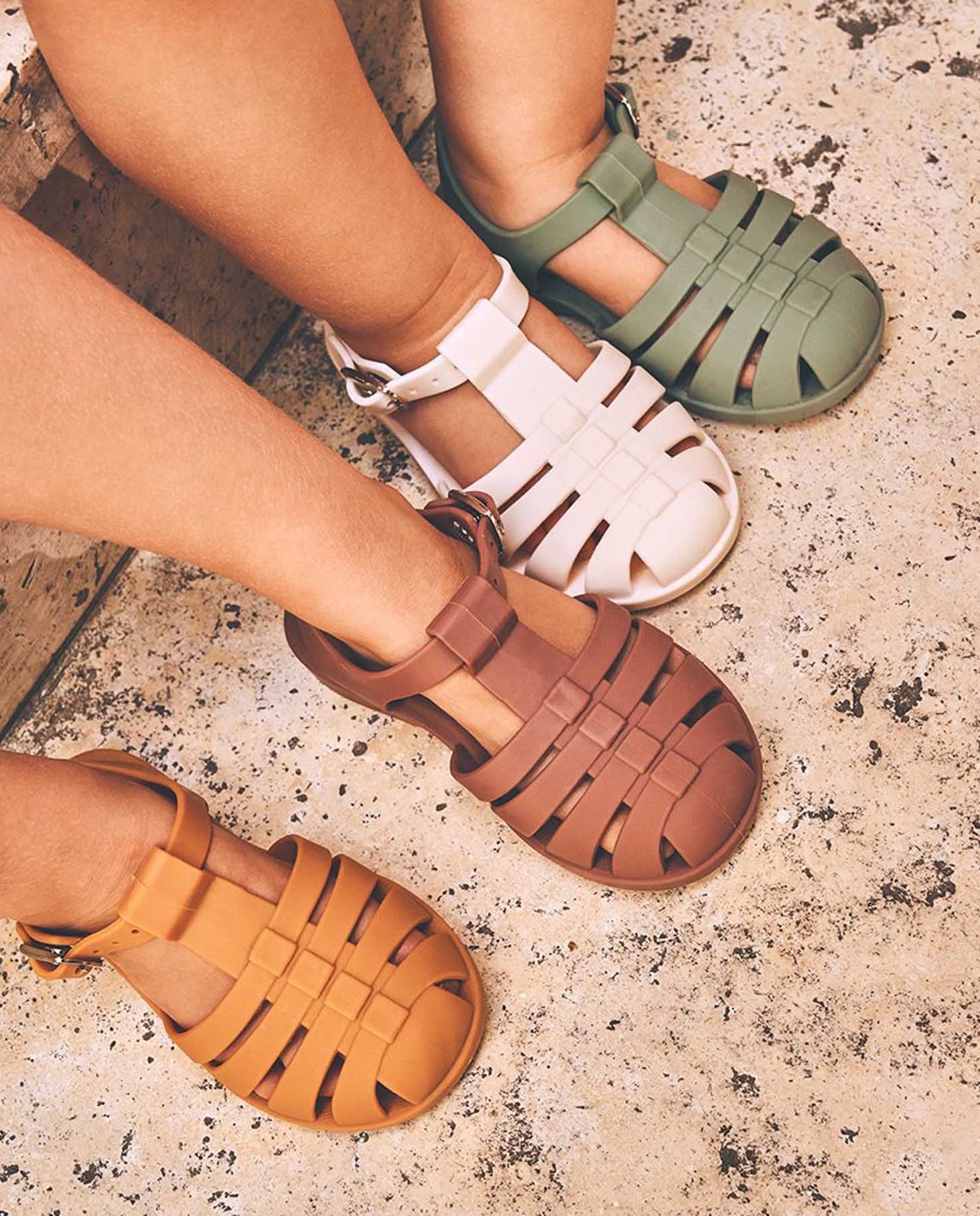 Las sandalias Bre son unas sandalias de playa infantiles flexibles y libres de productos químicos nocivos. Perfecto para la playa, ya que el PVC no absorbe agua y tu pequeño
