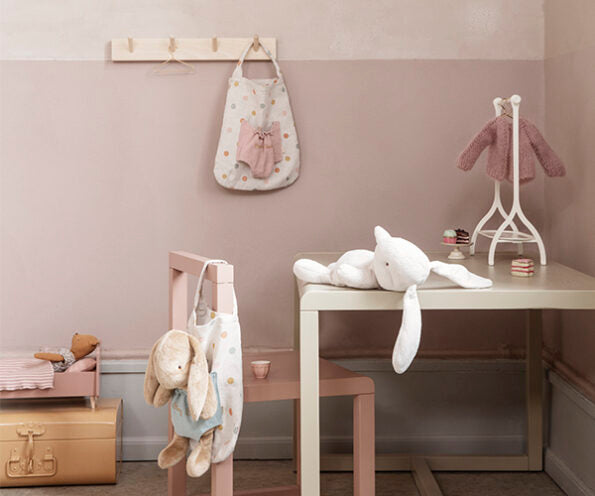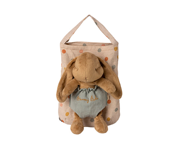 Os coelhos Holly e Bob vêm com uma bolsa, dentro de um pequeno bolso frontal para levá-los para qualquer lugar.