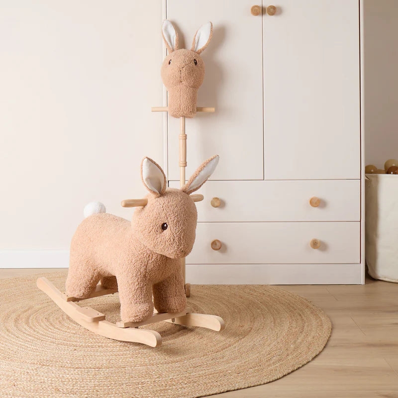 Faça os olhos do seu filho brilharem! Este fofo animal de balanço em forma de coelhinho chamado Fine encantará meninos e meninas. O coelho de balanço é o brinquedo perfeito para crianças a partir de 12 meses e pertence ao quarto de qualquer criança. O Fine é feito de bouclé macio e fofinho e será um bom amigo e companheiro leal para o seu pequeno, trazendo muita diversão, alegria e risadas. Ele estimula a vontade de se mover, desenvolve as habilidades motoras e treina o senso de equilíbrio. A estrutura do balanço é feita de madeira maciça e possui um dispositivo antiderrapante. Duas alças são fixadas para segurar durante o balanço, e os pés podem ser apoiados nos apoios. Isso permite que os pequenos balancem com segurança e despreocupação. O animal de balanço, adequado para crianças a partir de 1 ano, pesa robustos 4 kg e pode suportar uma carga de até 26 kg.