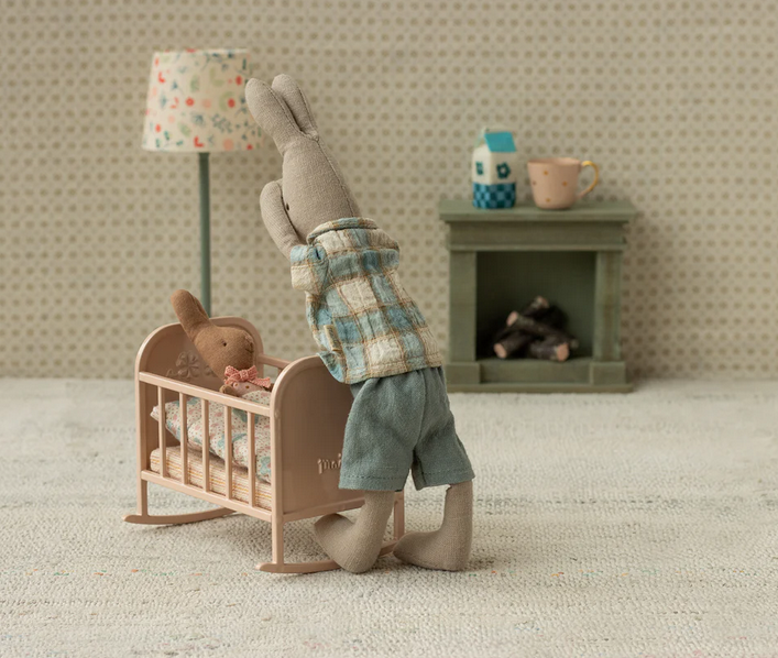 Um coelho clássico feito de tecidos naturais macios que proporcionam um toque e uma aparência encantadora . O coelho tamanho 1 cabe na Casa de Miniatura e em todos os móveis de tamanho Mini e Miniatura. O tecido pode variar.