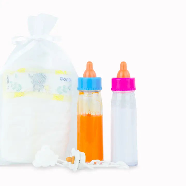 Bolsa em tule com acessórios para bonecas, incluindo fralda, biberões e chupeta.