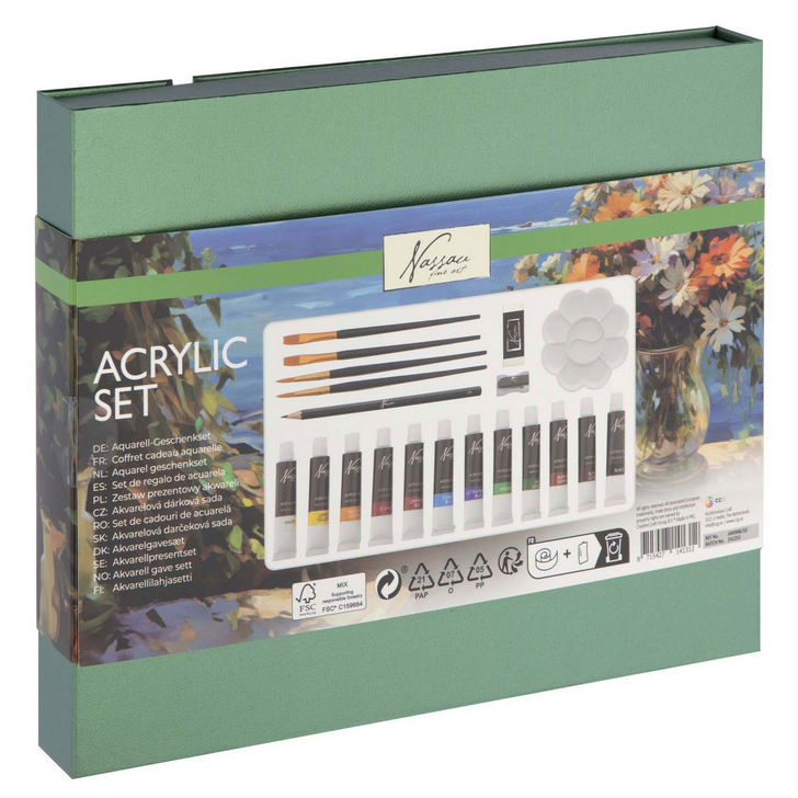 Conjunto em acrílico com 21 peças. Este conjunto contém tinta acrílica, paleta, lápis de desenho, borracha e afia.