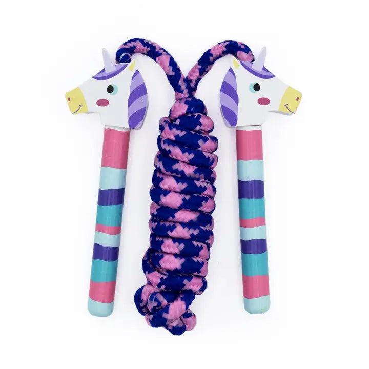 CORDA DE SALTAR DIVERTIDA: As crianças vão adorar esta linda corda de saltar com cabos de madeira pintados em forma de unicórnio e uma corda de cores vivas.
