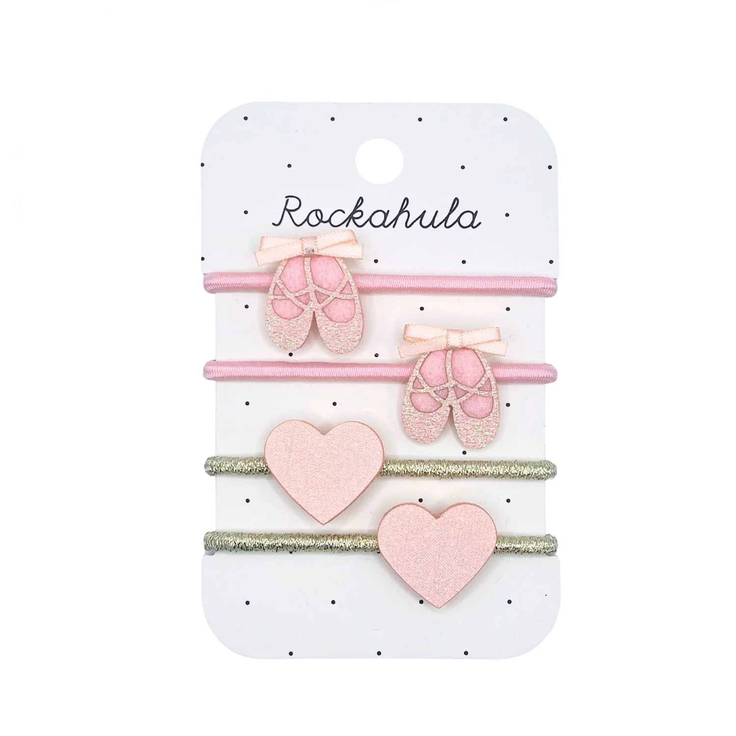As sapatos de ballet mais delicadas, num suave tom rosa com glitter, adornam este conjunto de quatro póneis. Inclui dois corações de cetim com elásticos dourados e dois pares de sapatos de ballet brilhantes com um bonito laço cor-de-rosa.