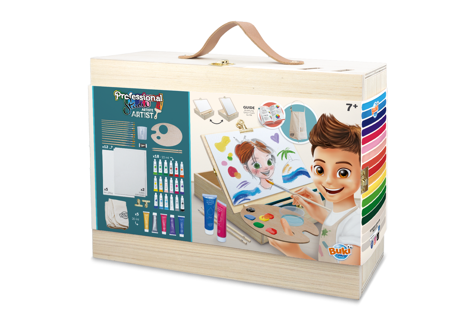 Acessórios incluídos: 1 avental de artista, 2 telas finas formato A4, 5 folhas de papel A4 de 230 g, 2 clipes de metal para as fixar, 12 pincéis de diferentes formatos e tamanhos, 1 borracha, 1 lápis HB, 1 lápis 2B, 1 paleta de madeira com copo, 18 tubos contendo 22 ml de tinta acrílica e 5 tubos contendo 20 ml de tinta glitter.