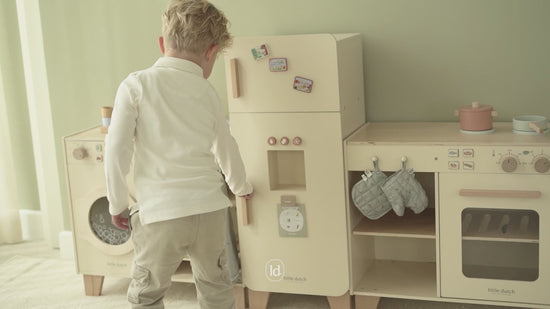 Mantenha os seus alimentos frescos neste bonito frigorífico de madeira! Possui um prático compartimento de congelador com máquina de fazer gelo e espaço suficiente para armazenar os mantimentos de forma organizada, incluindo um compartimento especial para ovos. Perfeita para tornar a brincadeira de mercadinho e cozinha ainda mais realista. Com este frigorífico, as crianças vão divertir-se durante horas enquanto aprendem sobre alimentos e armazenamento. Um complemento maravilhoso para qualquer cozinha de brincar!