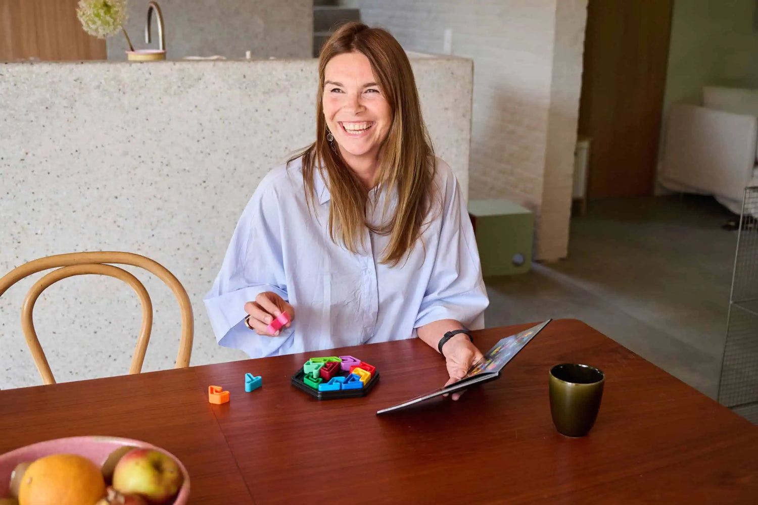 Conteúdo da Caixa: 1 tabuleiro hexagonal com tampa (ideal para viagens), 10 peças de puzzle coloridas, 1 livro com 120 desafios e soluções