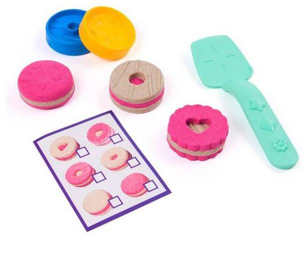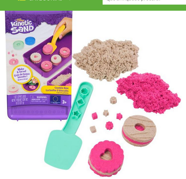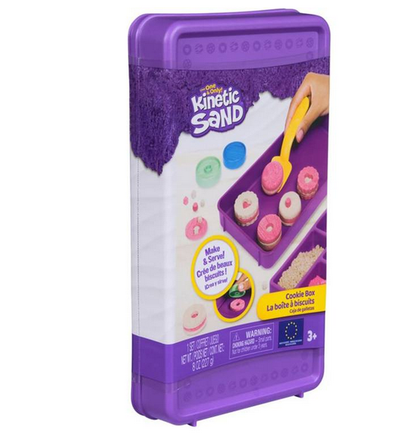 A "Kinetic Sand Caixa de Bolachas" da Spin Master é um conjunto de jogo sensorial que oferece a meninas e meninos uma experiência criativa e envolvente. Este kit inclui 227 gramas de areia cinética em duas cores vibrantes: rosa e castanho. A areia, feita de materiais naturais, é conhecida pela sua textura suave e maleável que se aglomera facilmente, permitindo uma limpeza sem complicações. O conjunto vem com uma caixa que também funciona como recipiente de armazenamento, uma espátula com mini moldes integrados e dois moldes de dupla face para criar formas variadas.