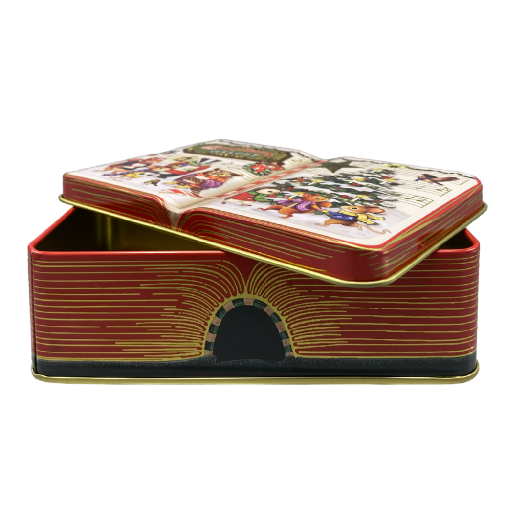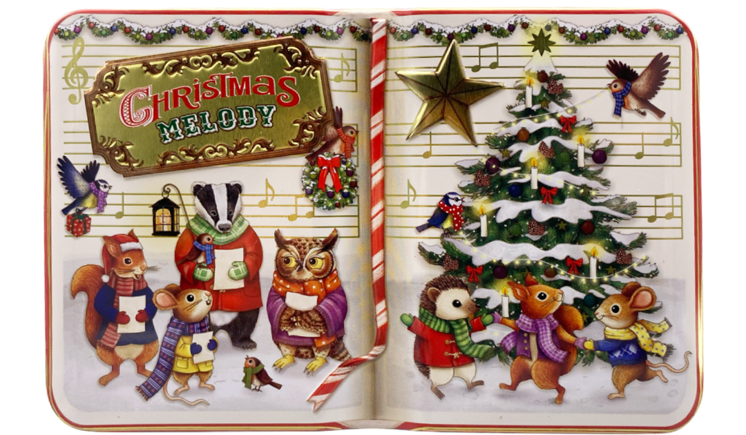 – Pequena lata retangular com tampa com estampado extravagante e um coro de animais a cantar uma canção de Natal. Levanta a tampa em cima.