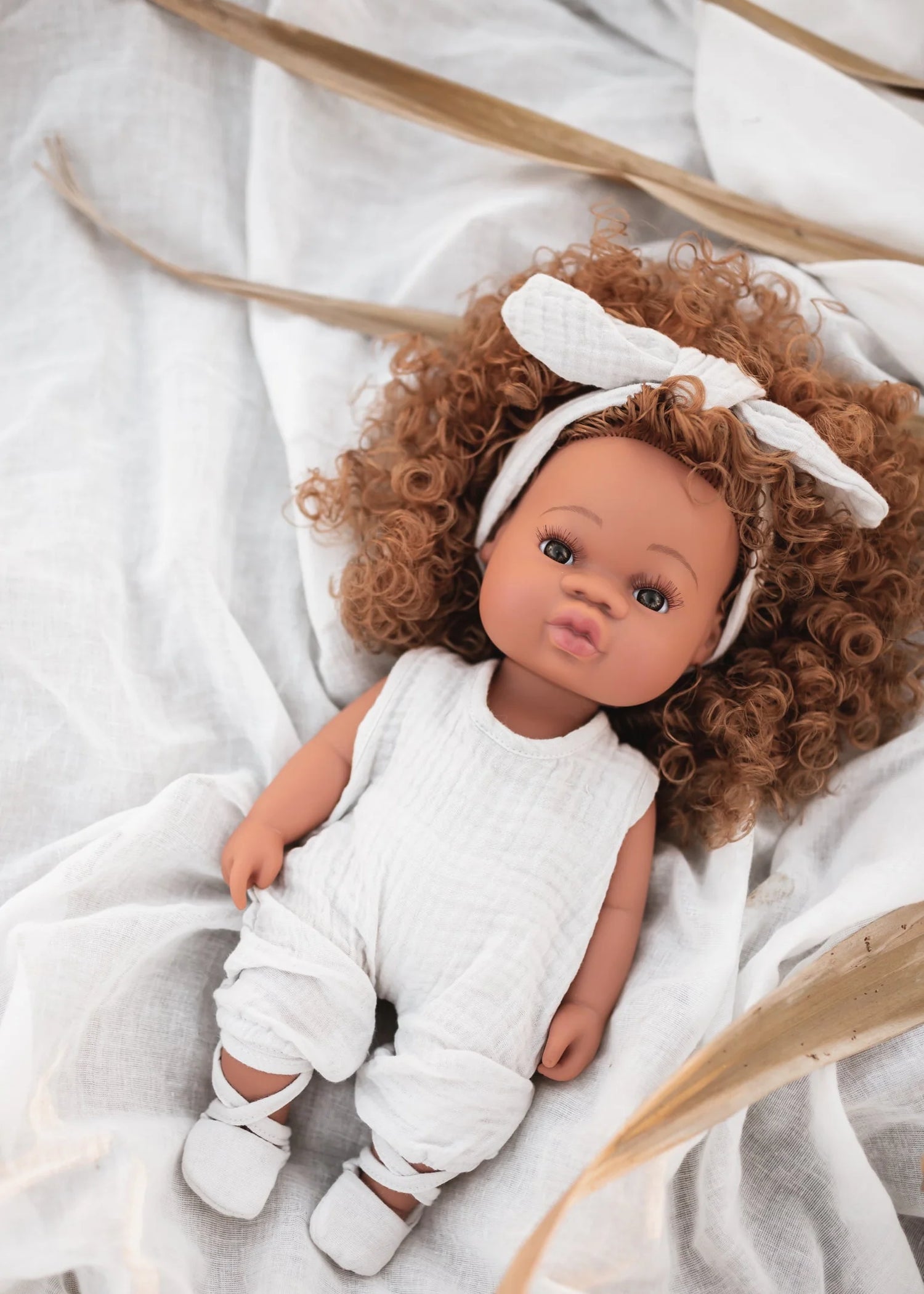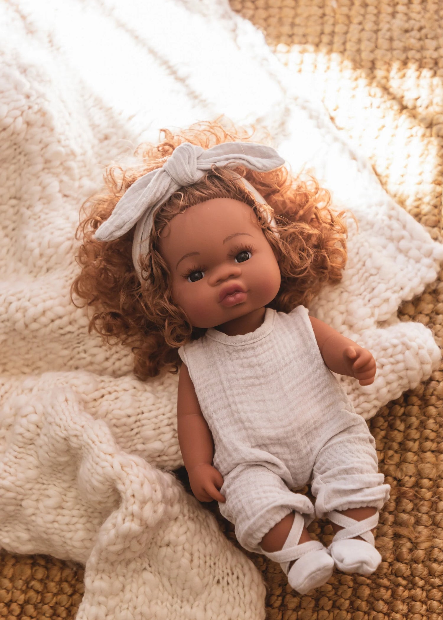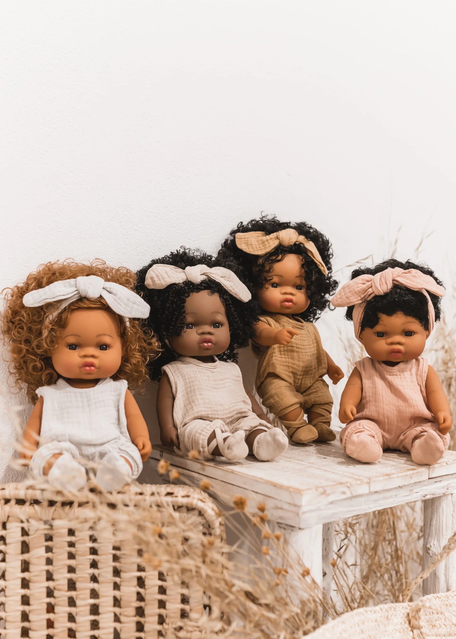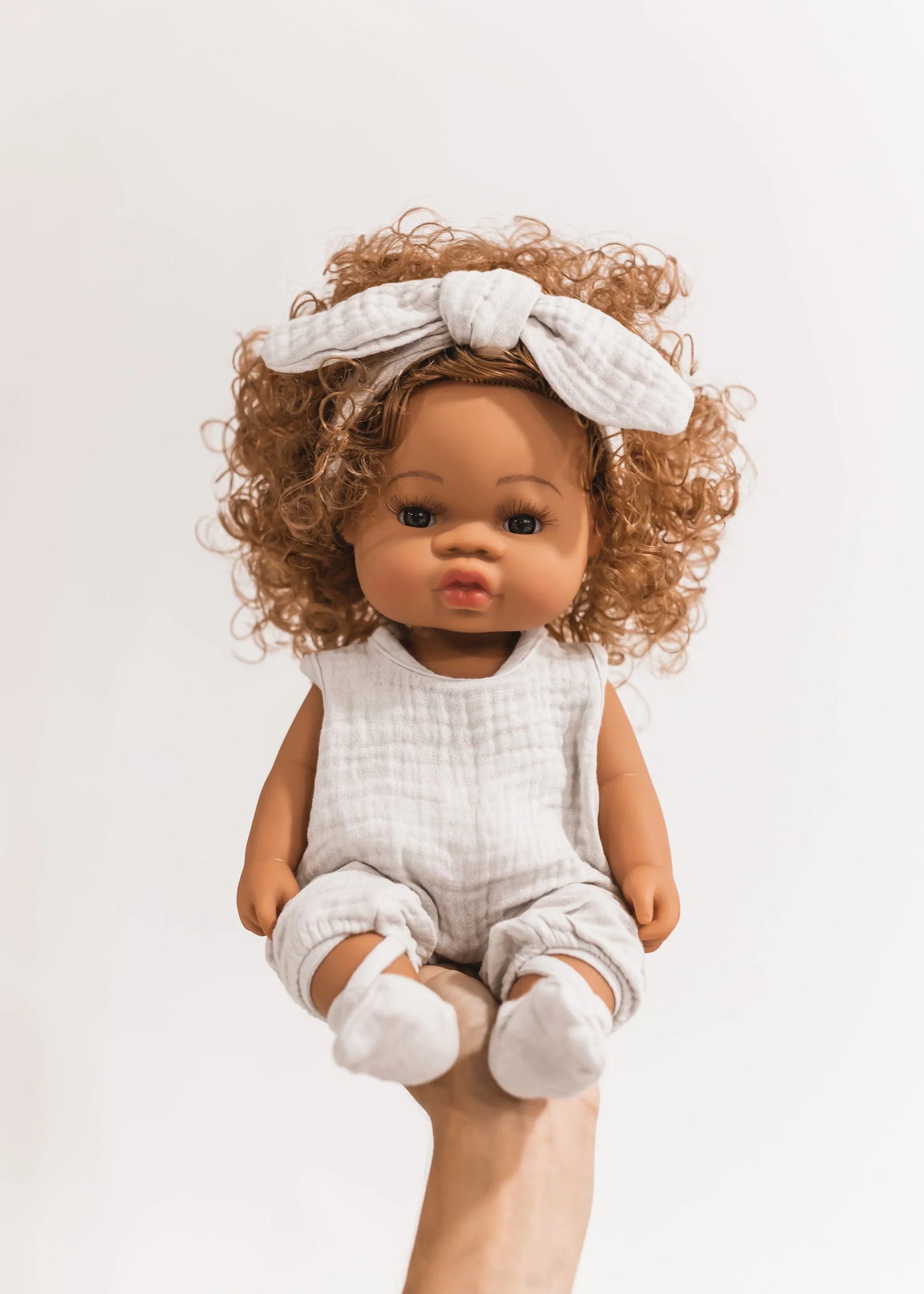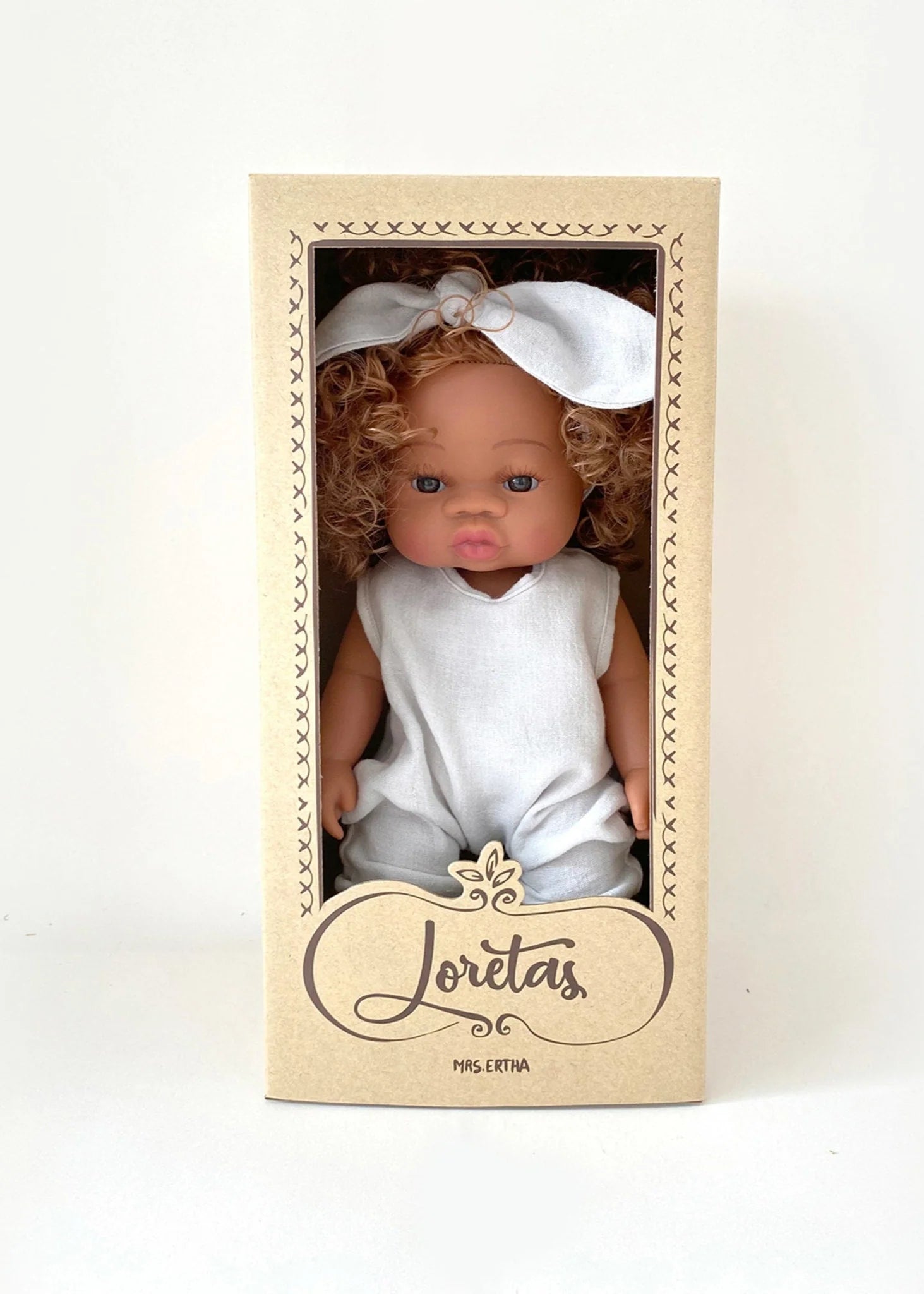 Cada Loreta inclui um conjunto de roupa interior, uma faixa para o cabelo, um macacão e um par de sapatos, feitos à mão em Portugal com tecido de gaze 100% algodão. A embalagem extra resistente é feita de cartão reciclado.