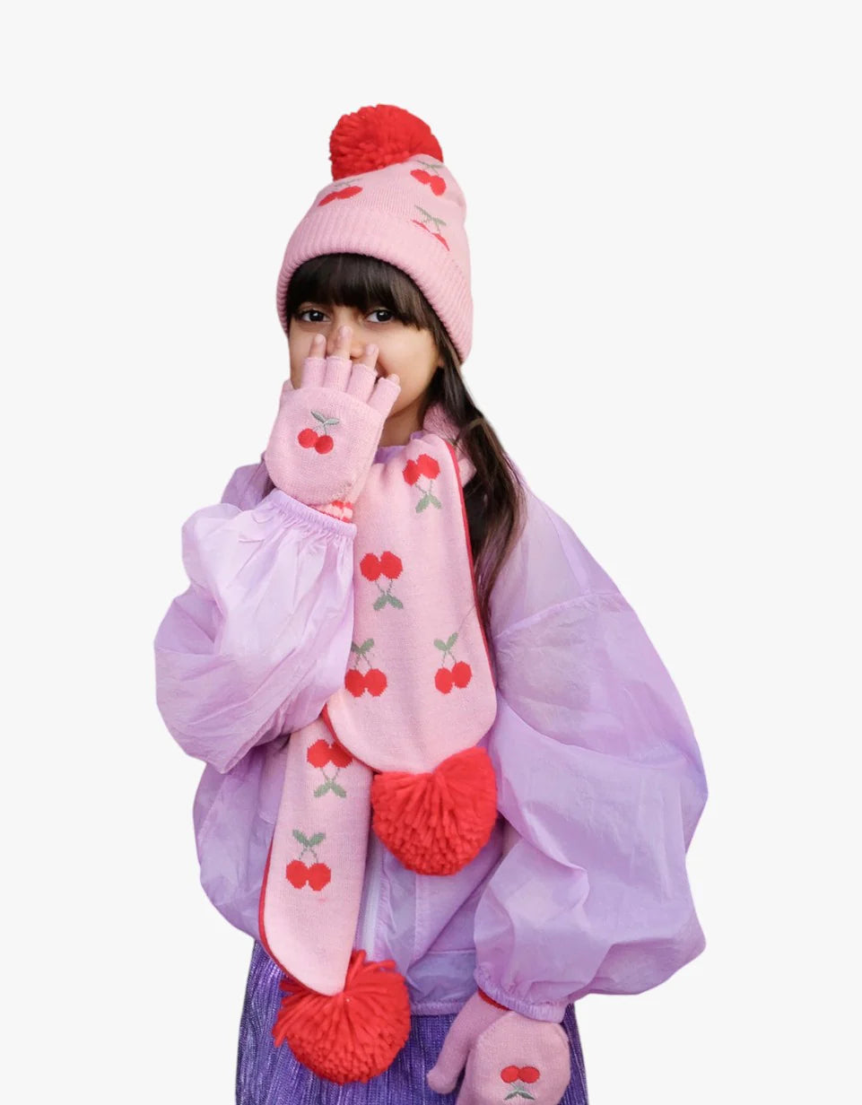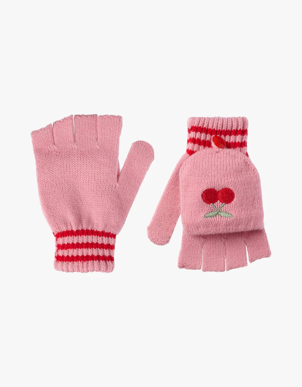 Adornadas com cerejas vermelhas, estas luvas sem dedos têm uma parte superior forrada em polar que pode ser fechada com um botão quando não está a ser utilizada, e um polegar incorporado.