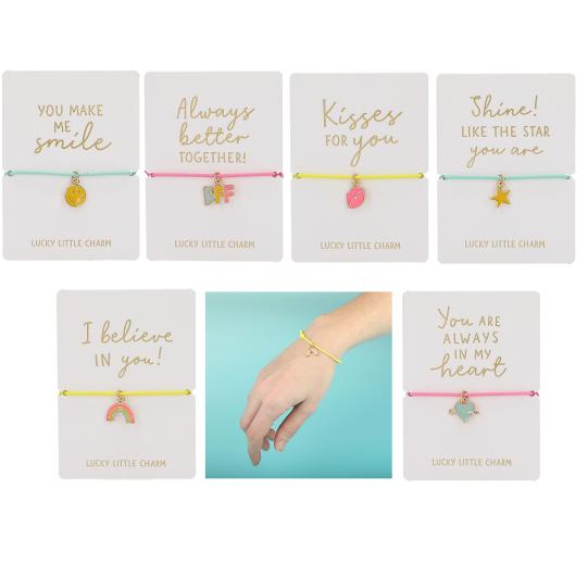 As pequenas pulseiras da sorte consistem em uma pulseira elástica colorida e um pingente figurativo fofo. Apresentadas em um cartão com palavras gentis impressas em folha de ouro. 6 motivos de pingente: rosto sorridente, arco-íris, estrela, coração, lábios, BFF. As pulseiras podem ser ajustadas em tamanho.