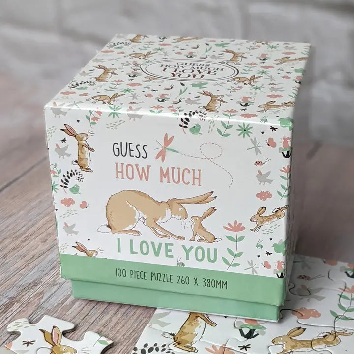 Puzzle de 100 peças no design Guess How Much I Love You. Puzzle é apresentado em uma caixa de cubo detalhada.