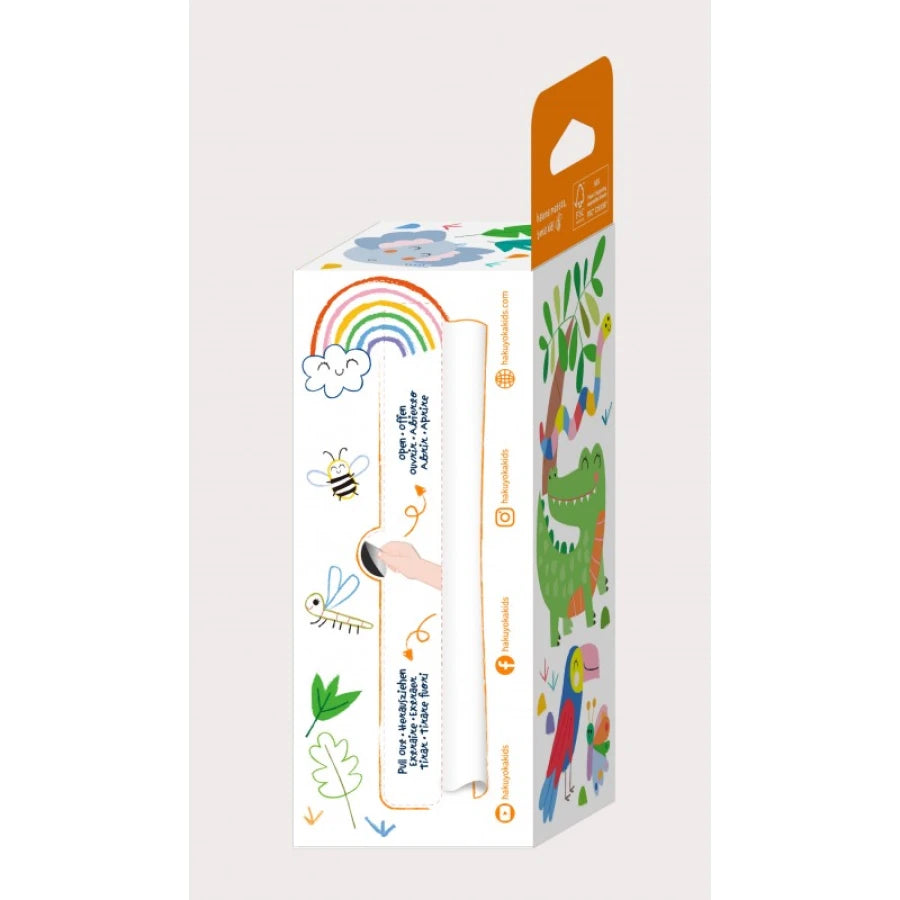 O kit mini Rolo de Colorir Safarai inclui uma folha de 2 metros de comprimento que pode ser dividida em folhas menores de 20 cm através da linha perfurada. No total podemos colorir e decorar de forma individualizada 10 folhas imagens divertidas