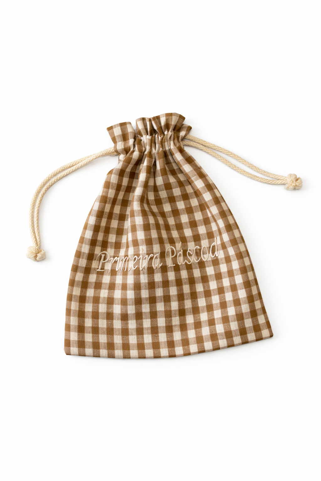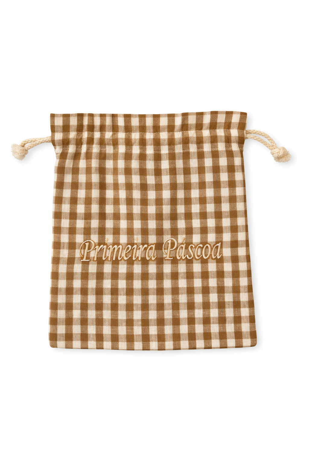 O nosso saquinho de algodão personalizado é a escolha perfeita para tornar a primeira celebração de Páscoa do seu bebé ainda mais especial. Com um design clássico de listras em tons Castanho e um bordado sofisticado, este artigo combina funcionalidade com uma estética impecável.