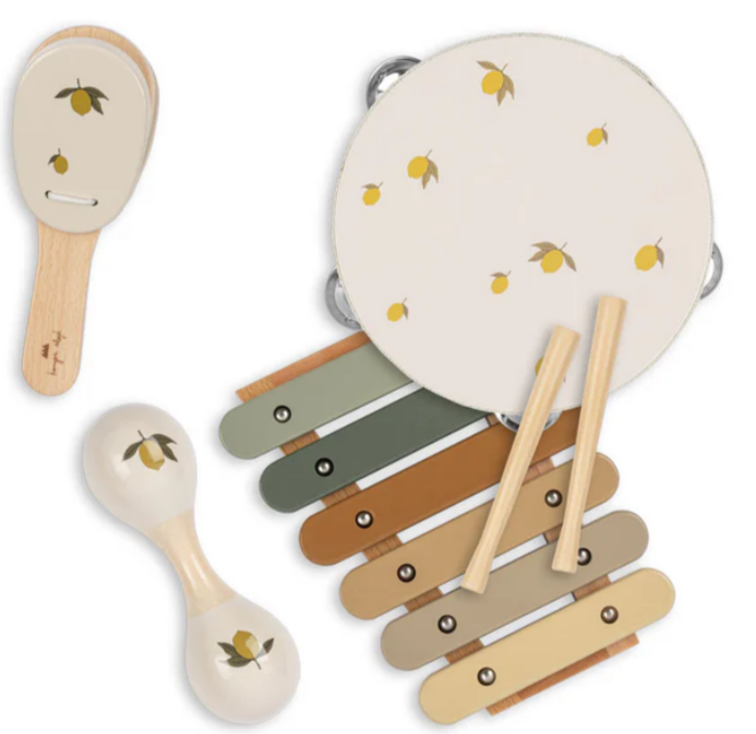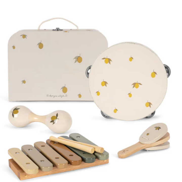 Conjunto de instrumentos musicais com acabamento brilhante, incluindo pandeiro, castanholas, maracas e xilofone com baquetas. Os instrumentos vêm em uma pequena maleta.