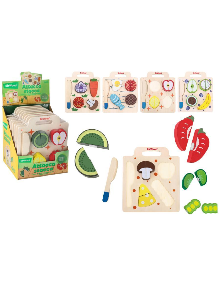 Descubra a tábua de corte de madeira FRUTAS, LEGUMES E SOBREMESAS COM VELCRO, um brinquedo educativo que transforma qualquer criança num pequeno chef! Graças às peças de fruta, legumes e sobremesas unidas com velcro, os mais pequenos podem facilmente prendê-las e desprendê-las, proporcionando uma experiência de brincadeira realista e envolvente. Este brinquedo estimula a imaginação e as habilidades manuais, incentivando a criatividade enquanto as crianças se divertem a preparar as suas receitas imaginárias. Perfeita para desenvolver as capacidades motoras e sociais, a tábua de corte é uma ótima opção para brincadeiras individuais ou em grupo. Uma forma divertida e interativa de aprender brincando!